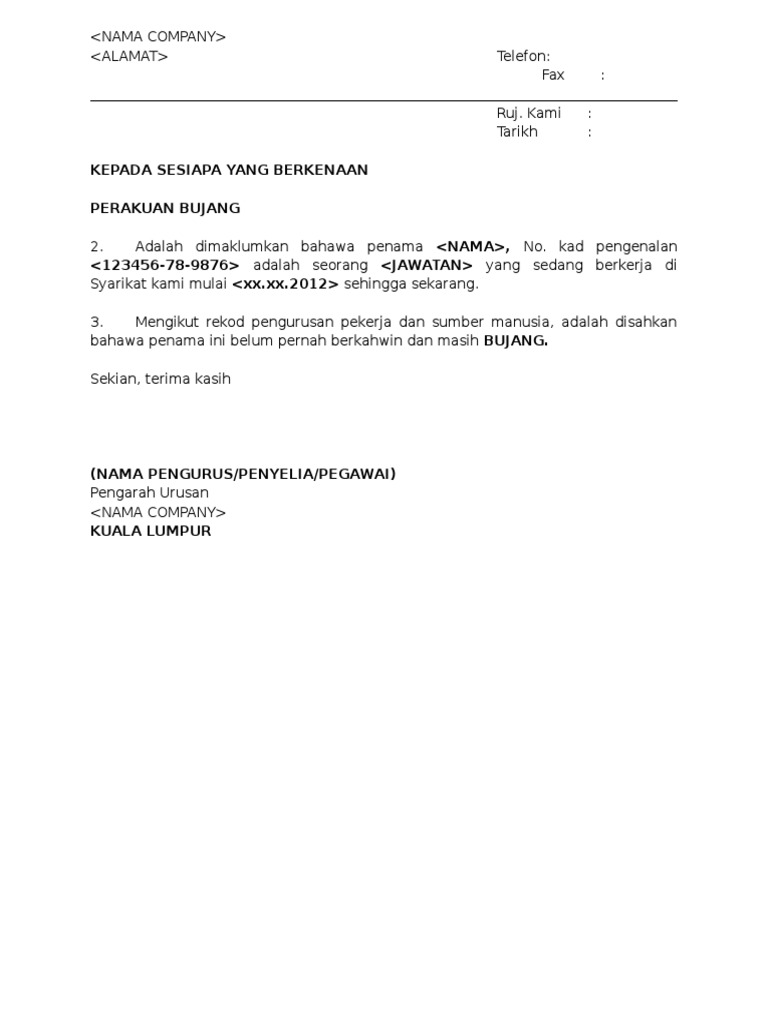 Contoh Surat Bujang : Contoh Surat Akuan Bujang Dari Syarikat Contoh Surat / Ada perbezaan rm200 antara b40 dan m40.. Berkahwin dan suami atau isteri bekerja, bercerai atau kematian suami atau isteri, atau bujang yang mempunyai anak angkat 2. Anda akan dapat melihat paparan yang menunjukkan permohonan berjaya dihantar dan diterima. Berkahwin dan suami atau isteri tidak bekerja kategori 3 : Jan 11, 2012 · assalamualaikum mohon bantuan sy pelukan contoh surat "pertukaran tempat bertugas' dari penang ke kedah. Ada perbezaan rm200 antara b40 dan m40.